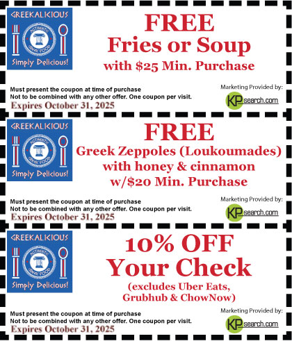 Discounts & Coupons - Big Savings by Greek Creations Discounts & Coupons - Big Savings by Greek Creations DUE TO SUPPLY CHAIN ISSUES BEYOND OUR CONTROL, SOME ITEMS MAY HAVE THEIR PRODUCTION TIMES DELAYED Free shipping on orders over $50! Use code: SHIPITFREE Home Discounts & Coupons Free shipping on orders over $50! Use code SHIPITFREE at checkout.